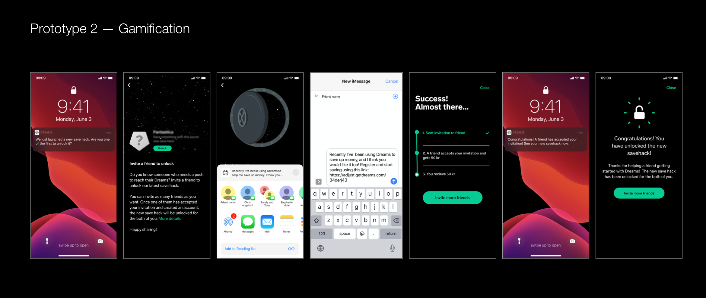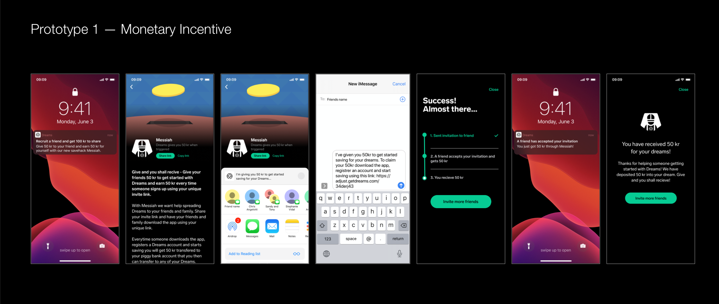 After four weeks of testing and refining the design, we delivered a prototype ready to be implemented to Dreams. The chosen idea offered a monetary reward: both the inviter and invitee receive 50 SEK. We did not include any pre-written messages, instead we allowed direct link sharing from the app and for the user themselves to write their own message if they wanted to.